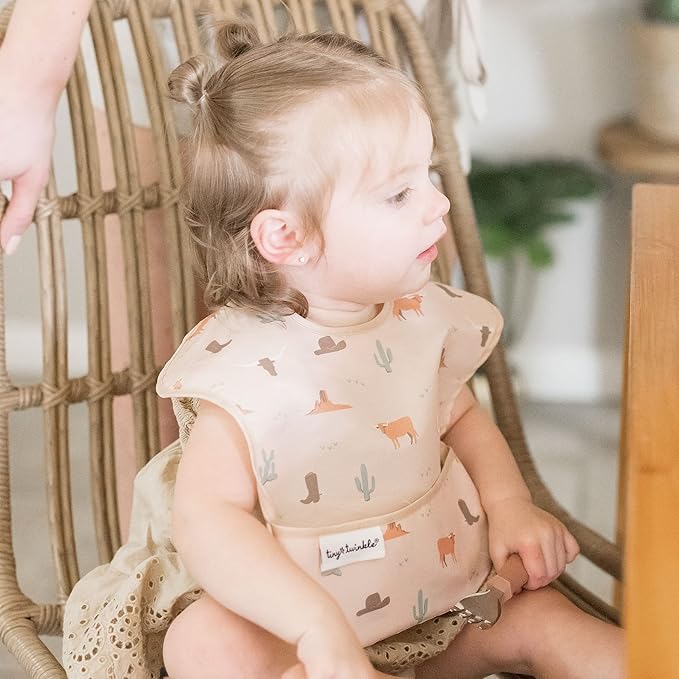 Tiny Twinkle Mess-Proof Baby Bibs for Eating | Waterproof, Wipeable Toddler Bibs with Catch-All Pocket | Feeding Bibs for Girls & Boys(3 Pack,Cowboy)