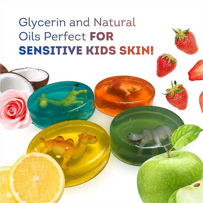 4 Soap Bars for Kids with Funny Animals Surprise Inside - Collect All 12 Wild Animals Toys - Moisturizing Children's Skin - Lemon, Strawberry, Green Apple, and Rose - Handmade in USA Soap Set for Kids