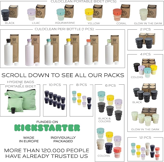 - 100% MADE IN EUROPE. Available in 1pcs, 2pcs, 4pcs, 6pcs, 8pcs, 10pcs, and 12pcs. Individually packaged. Scroll down to see our peri bottle in different colors: black, yellow, aquamarine, lilac, coral, or white (which glows in the dark!)