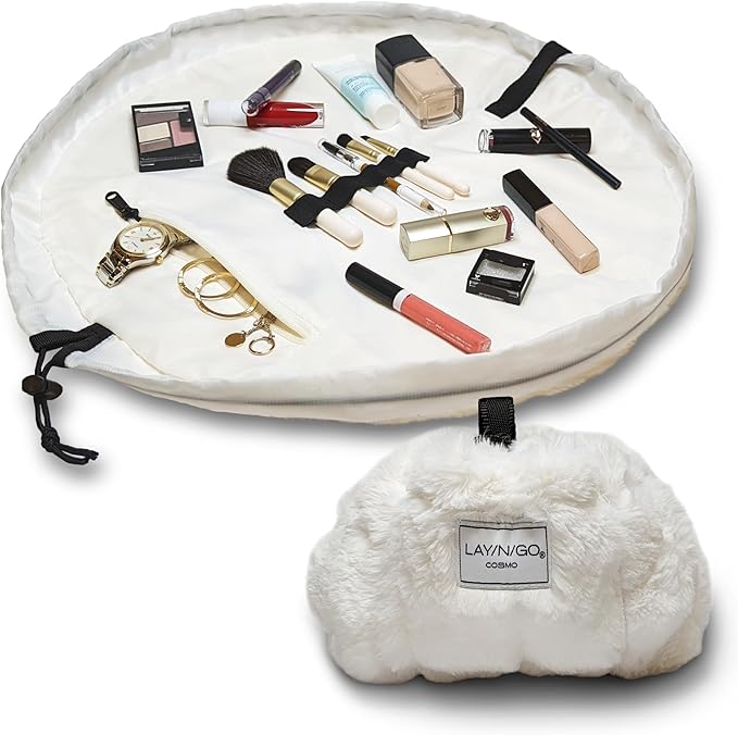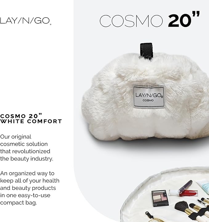 Lay-n-Go Cosmo Drawstring Cosmetic & Makeup Bag Organizer - Portable Drawstring Makeup Bag w/Zipper Pocket, Makeup Loops & More - Durable, Machine Washable Toiletry Bag (20", Comfort/White)