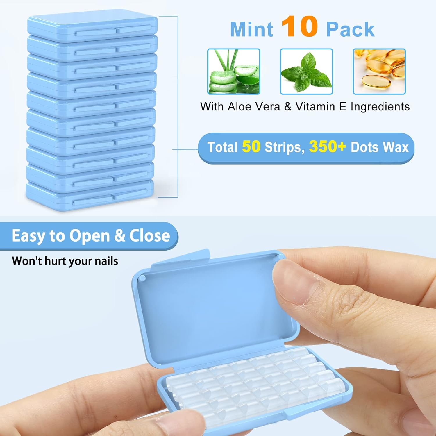 Braces Wax, Premium 50 Precut Orthodontic Wax Strips 350+ Dots, Blue Cases, w/Storage Box & 2 Applicator Tools, Food-Grade Dental Wax for Braces - Stick Better (Mint+Aloe Vera +Vitamin E)