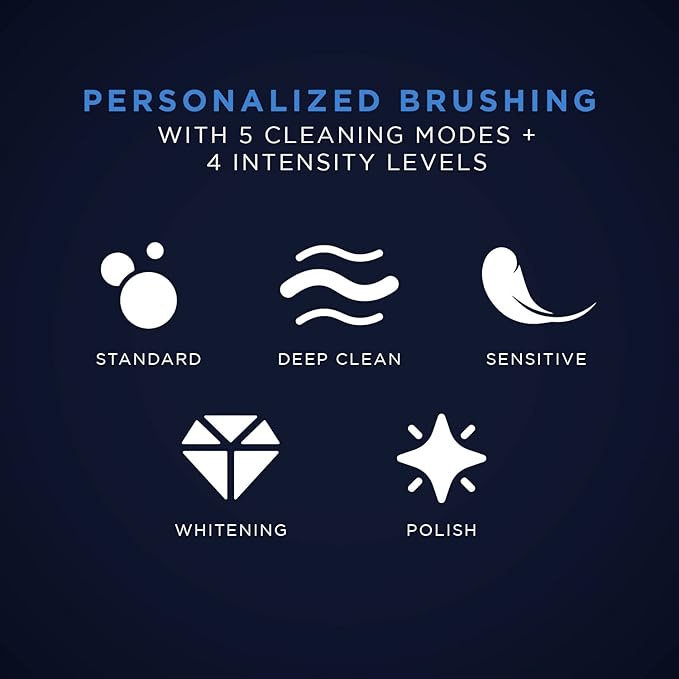 - [Professional Clean] Achieve a professional cleaning with the soft bristle toothbrush and customizable settings. A 2-minute toothbrush timer with 30 second interval pauses help to ensure even cleaning throughout. Pressure sensors also automatically lower vibration strength to protect your enamels and gums when brushing too hard.