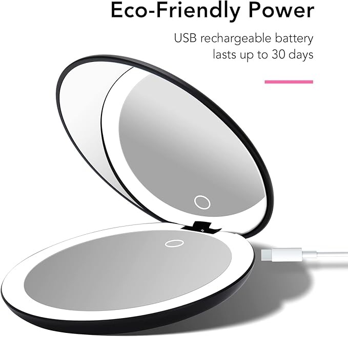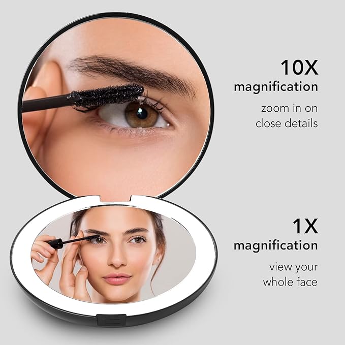 - Fancii Led Lighted Travel Makeup Mirror, Rechargeable With 10x/1x Magnifying & 3 Light Settings - Compact, Portable, Large 5” Wide Hand Mirror for Handbag and Purses (Black)