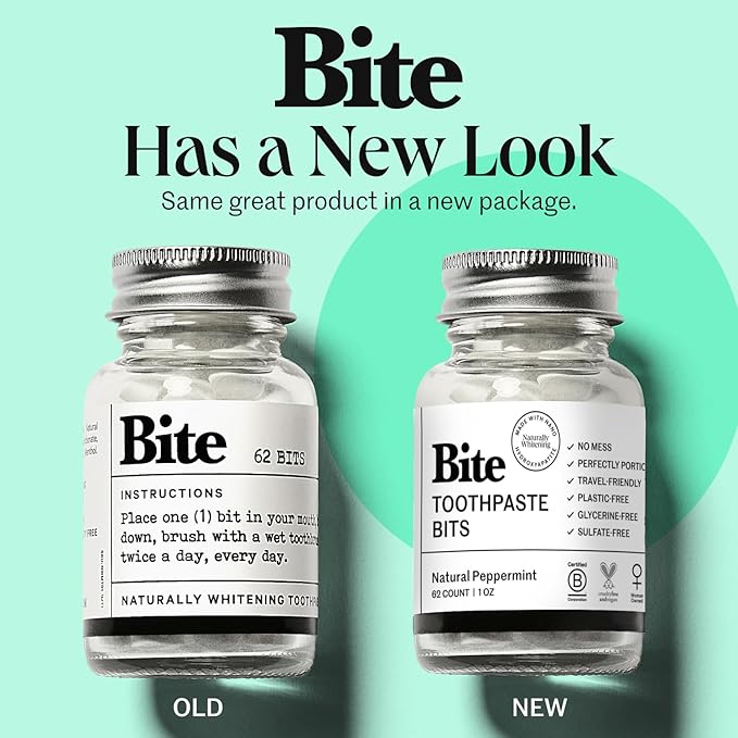 Bite Toothpaste Tablets, Xylitol & 5% Nano Hydroxyapatite Toothpaste Bits for Sensitive Teeth, Fluoride Free Tooth Whitening, Travel Size Dental Care for Adults & Kids, Made in USA, 124 Bits
