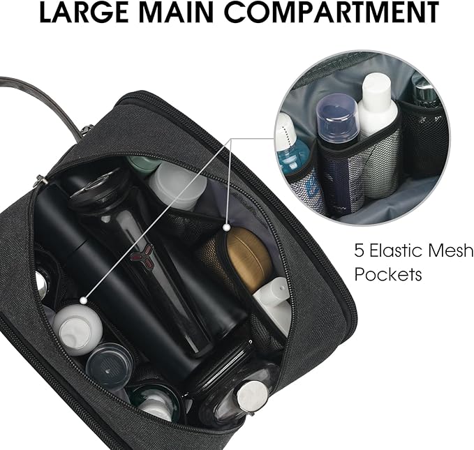 - Spacious Main Compartment - Sized at 9.8*5.1*6.3 inches, this compact dopp kit holds your travel-sized grooming essentials—like shampoo, face wash, toothpaste, and a deodorant. The wide opening makes it easy to pack a travel shaver, while five inner mesh pockets keep bottles upright and easy to reach.