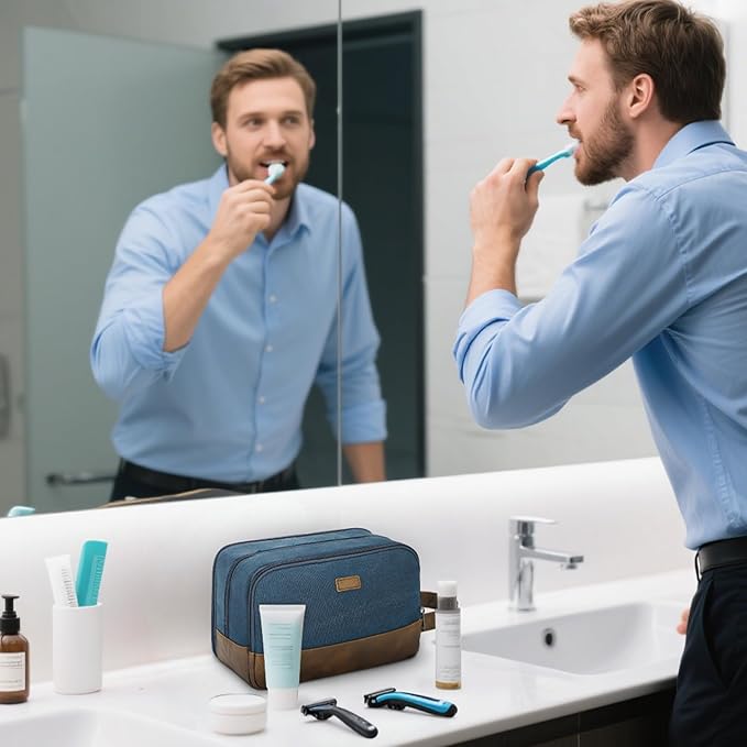 - Easy to Carry - Crafted from durable canvas with PU leather trim, this toiletries bag pairs rugged strength. The water-resistant fabric helps protect your essentials, while the leather handle makes it easy to carry or hang on the go.
