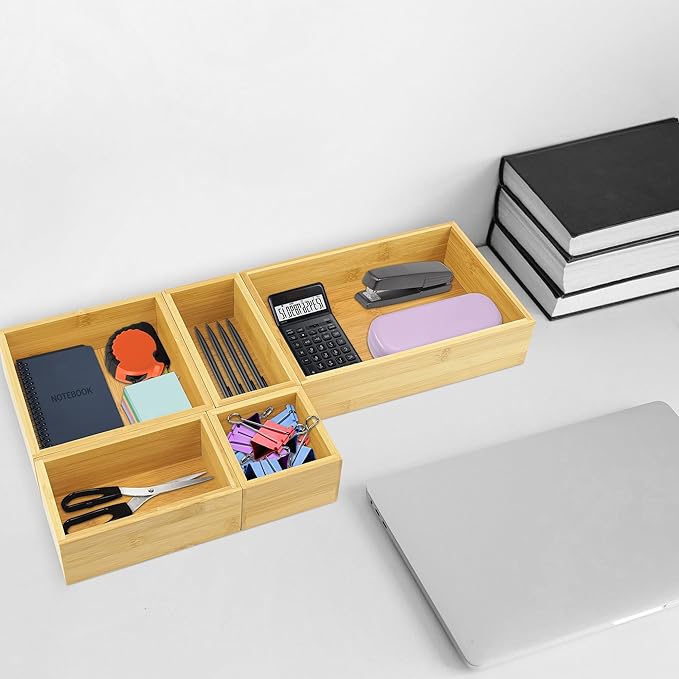 VaeFae 5 PCS Bamboo Drawer Organizers Set, 5-size Wooden Organizer Box, Storage Bins for Kitchen, Bathroom, Office, Bedroom and Living Room