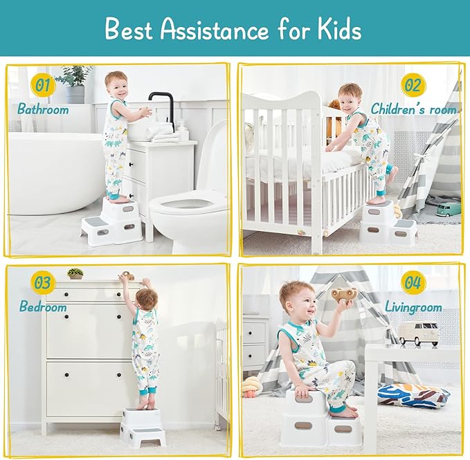 - 【Best Assistance for Toddlers】Two step stool for toddlers provides the best assistance for your growing toddlers. They can use it from potty training on the toilet to reaching bathroom sink brush teeth or wash hands, play piano as hold kids’ feet, sit to read books in nursery, and just about anywhere else that needs a little boost to reach.