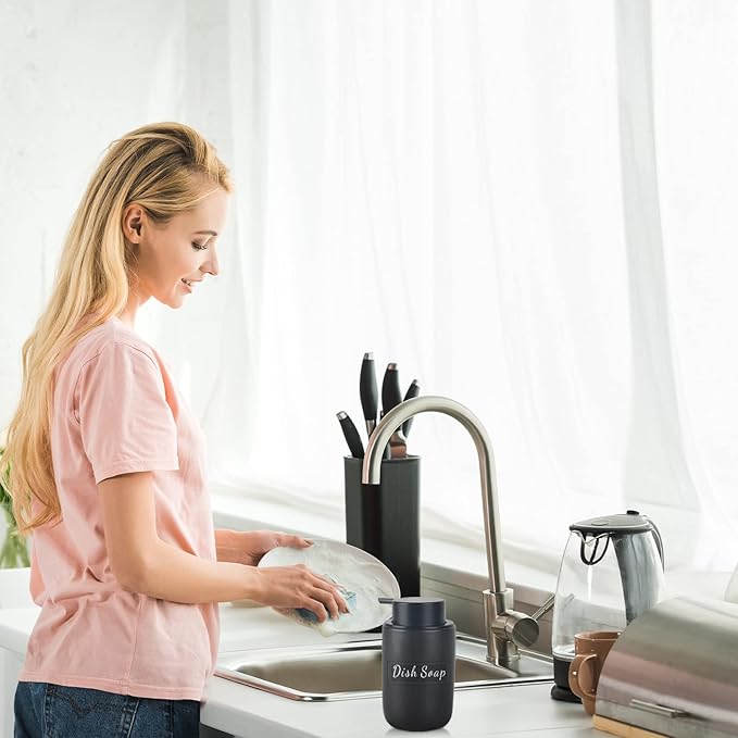 BosilunLife Black Soap Dispenser Set - 2 Pack 12oz Ceramic Dish Soap Dispenser with Rust Proof Pump for Kitchen, Hand Soap and Lotion Set Suitable for Farmhouse Bathroom Decor with Waterproof Labels