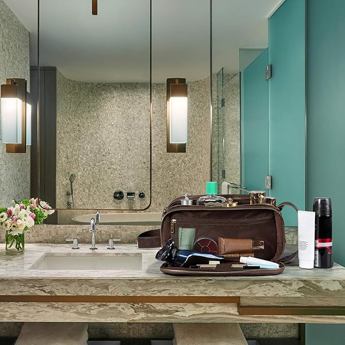 Elviros Toiletry Bag for Men, Large Travel Shaving Dopp Kit Water-resistant Bathroom Toiletries Organizer PU Leather Cosmetic Bags Fathers Day Gift (Medium, Chocolate)
