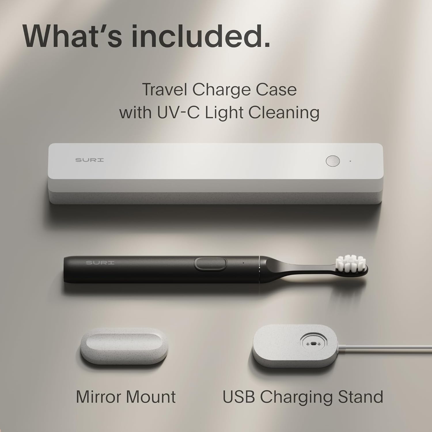 - UV-CLEANING TRAVEL CASE - SURI includes a slim travel case that uses UV-C technology to clean your tooth brush head in just 1 minute. It also charges your brush when plugged in. At last—a travel electric toothbrush you'll love