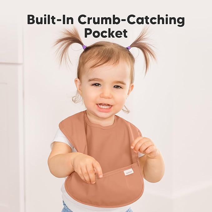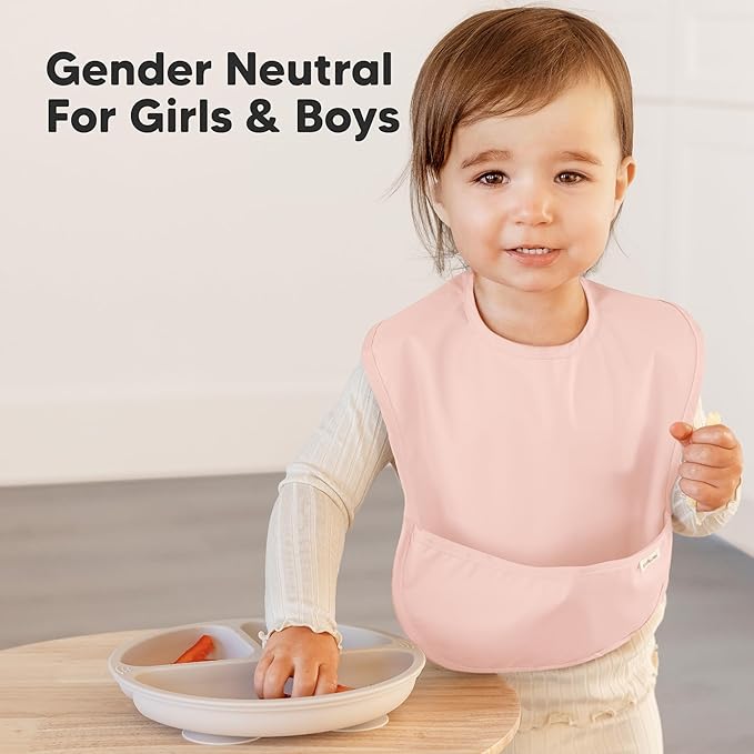 - Covers Upper Chest and Shoulders - Your baby can now enjoy self-feeding without soiling their clothes with the mess-proof bibs. This toddler bib for baby boys and girls comes with a wide food catcher pocket holds fallen food crumbs and purée spills.