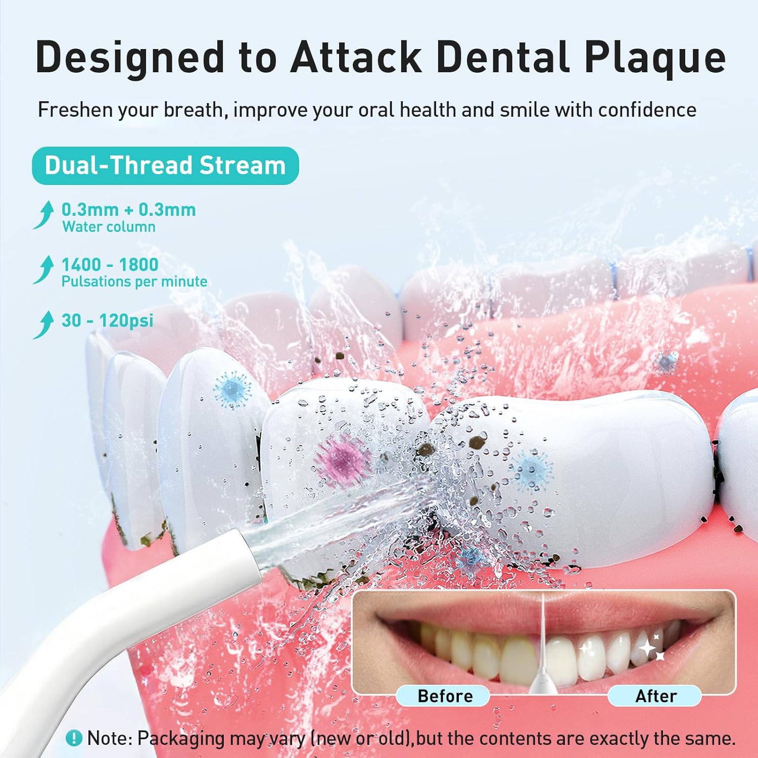 - IPX7 Waterproof and 3-Year Durability: Our wireless water dental pick boasts superior waterproofing, allowing easy cleaning and safe use during showers. Its upgraded motor delivers a more effective dual-stream water flow and is built to last for 3 years under typical use