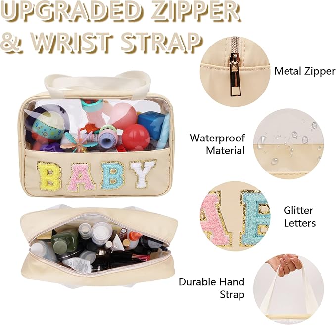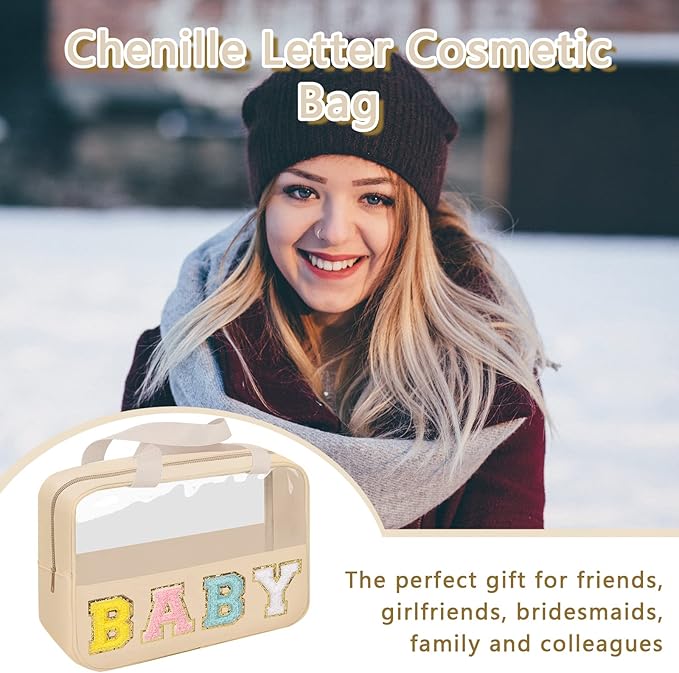 Iqimott Chenille Letter Patch Baby Bag, Preppy Clear Makeup Cosmetic Bag Large Toiletry Storage Tote Bag with Handle, Transparent Nylon Waterproof Organizer Zipper Pouch for Travel Women Girls(Beige)
