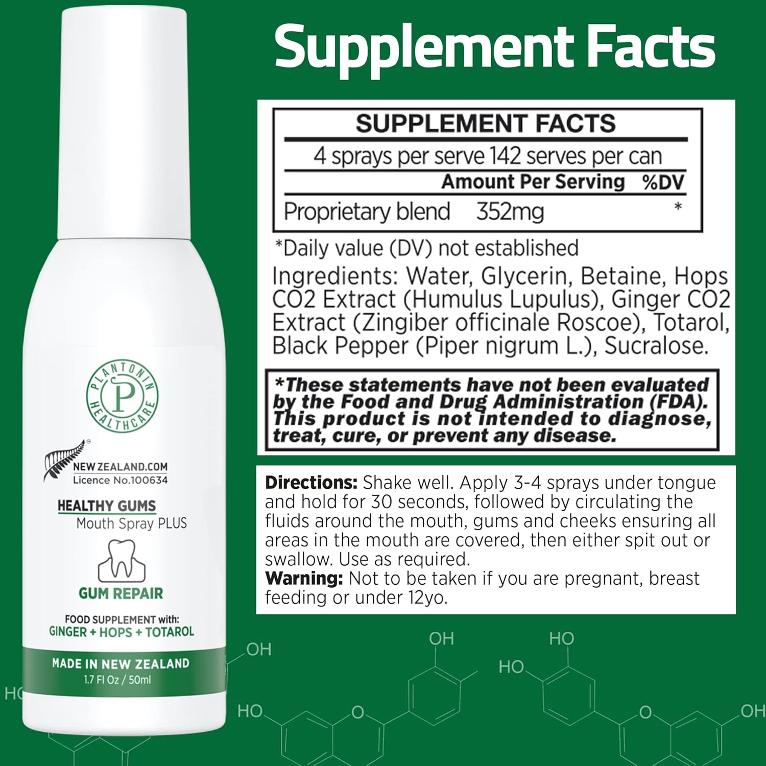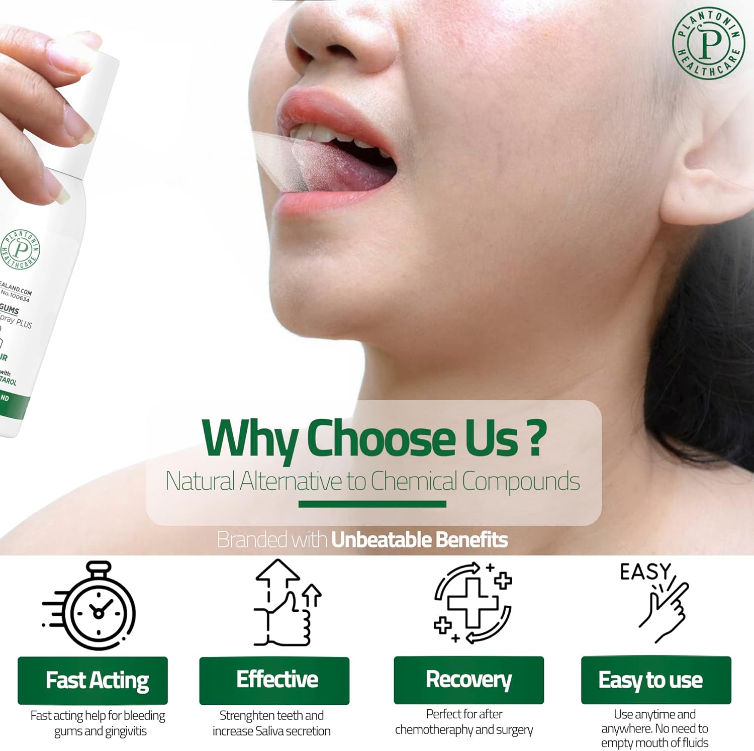 - A NATURAL ALTERNATIVE – Help relieve bleeding gums with a natural alternative that does not have nasty chemical compounds found in some mouthwash and toothpastes. Give your gums the oral hygiene that they deserve with Plantonin’s powerful Healthy Gums Mouth Spray Plus – Recommended by New Zealand Dentists.