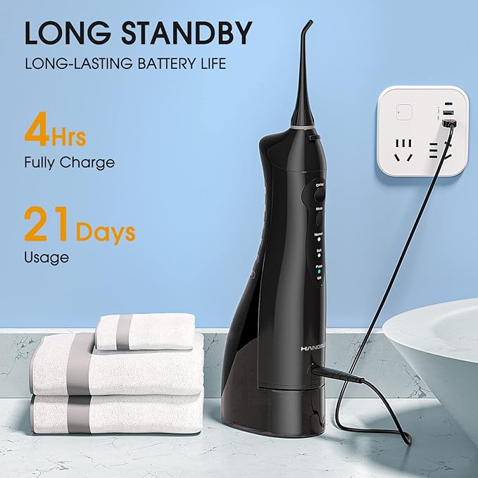 - Powerful Battery & Long Battery Life: Powerful battery was built in this water flosser teeth cleaner. 3 hours charging can be used 21 days! Package comes with USB charging cable (Adapter Not Included) which is compatible with 5V1A adapter or applicable to a USB port, such as power bank, laptop.etc.