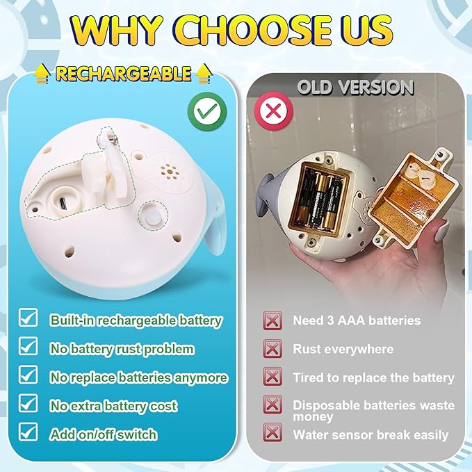 - Safe and Durable Use - no battery rust problems: We know that water leakage into the battery compartment is a significant problem of this cute whale bath toy. We design the built-in battery and use a silicone plug to protect the small USB charging port, preventing water seepage damage more effectively and protecting the baby's health. Our baby bath toys 12-18 months have longer service life than other brands. Have a try and Give your baby a cute interesting toddler pool toy