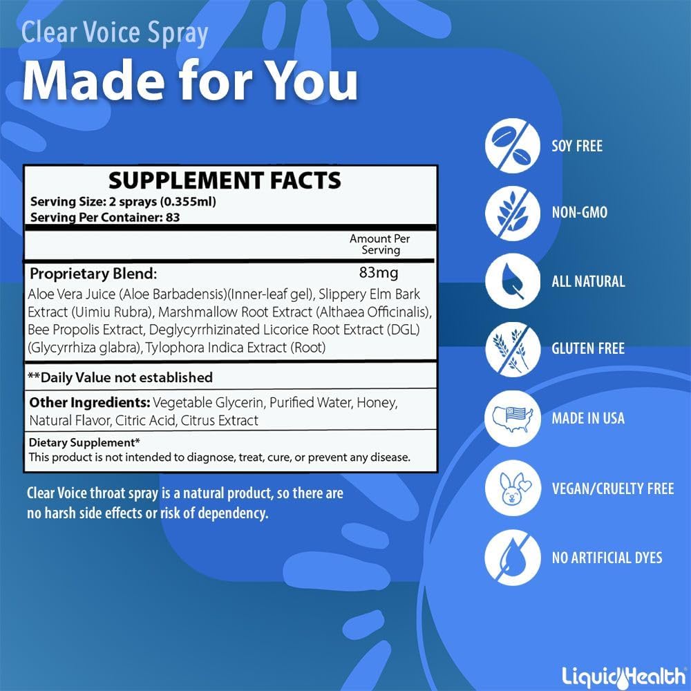 - Clear Voice Vocal Spray is the natural solution to eliminate scratchiness, dryness, or irritation in the throat allowing you to sound and feel your best.