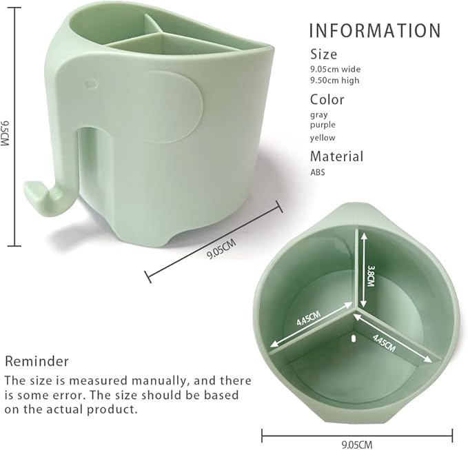 - 🐘💚VERSATILE TOOTHBRUSH HOLDER💚: RyanLemon toddler toothbrush holder with 3 sections and a hook, so our toothbrush holders for kids can hold different items and keep them apart and is big enough to hold electric toothbrushes and toothpaste. And the hook can be used for hanging bath balls.
