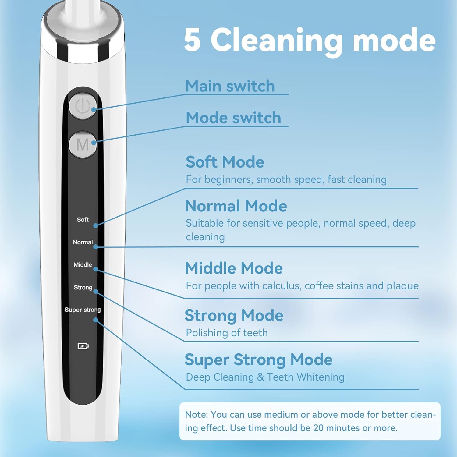 - 5 cleaning modes: Dental Calculus Plaque Remover has 5 modes, including soft, normal, middle, strong, super strong mode, corresponding to choose their own suitable mode to use, it is recommended to use medium or above mode for better cleaning effect. Use time should be 20 minutes or more. It can reduce the damage that manual dental tools may cause to your teeth and keep your teeth and gums healthy