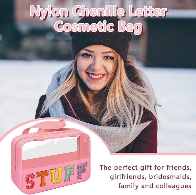 - 【Chenille Glitter Letters】Preppy letter cosmetic bag is 11.41x 7.87 x 3.54 inches. Made of high quality nylon and PVC material, lightweight and durable . Ideal as a clear makeup bag for travel, gym, bathroom, daily carry-on bag and luggage.