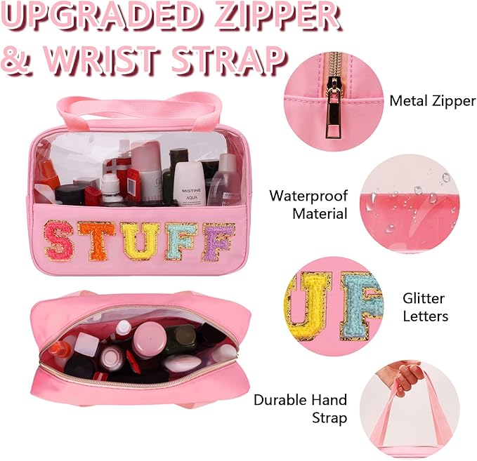 Iqimott Chenille Letter Patch Stuff Bag, Preppy Clear Makeup Cosmetic Bag Large Toiletry Storage Tote Bag with Handle, Transparent Nylon Waterproof Organizer Zipper Pouch for Travel Women Girls(Pink)