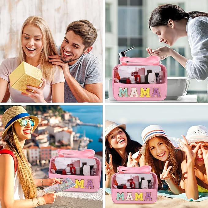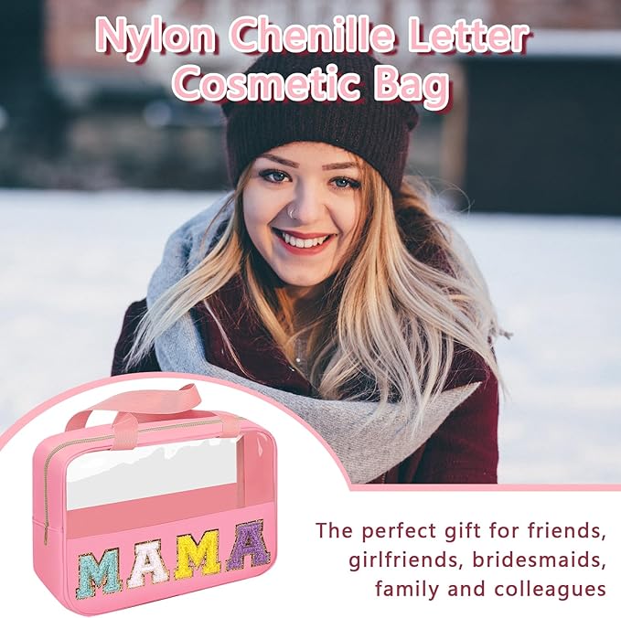 Iqimott Chenille Letter Patch Mama Bag, Preppy Clear Makeup Cosmetic Bag Large Toiletry Storage Tote Bag with Handle, Transparent Nylon Waterproof Organizer Zipper Pouch for Travel Women Girls(Pink)