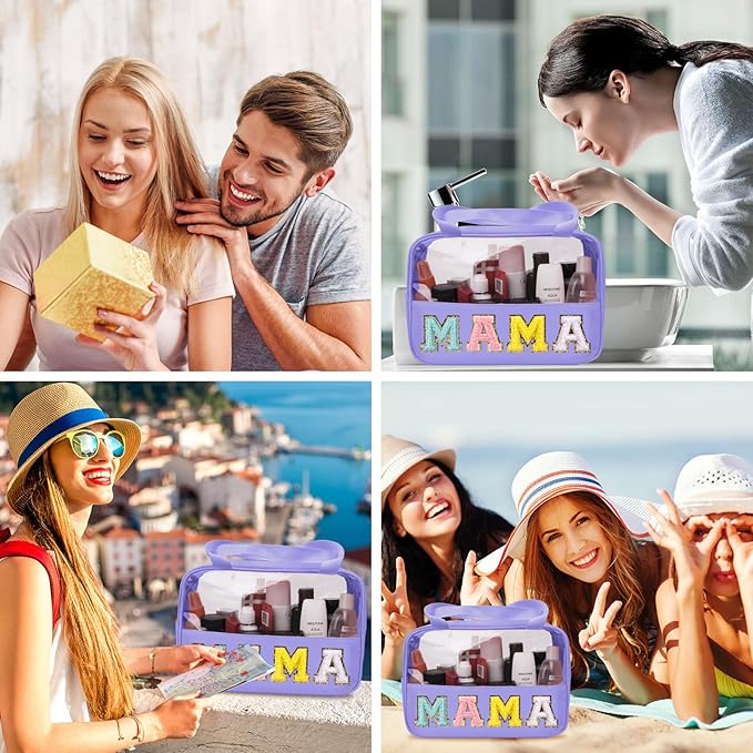Chenille Letter Patch Mama Bag, Preppy Clear Makeup Cosmetic Bag Large Toiletry Storage Tote Bag with Handle, Transparent Nylon Waterproof Organizer Zipper Pouch for Travel Women Girls(Purple)