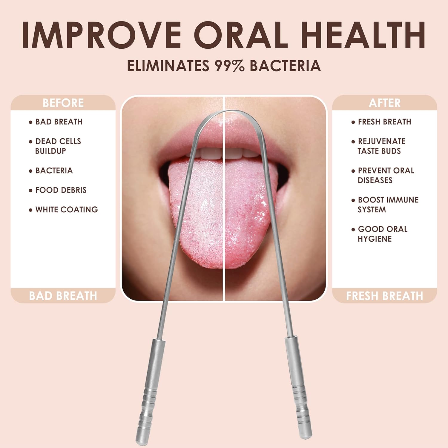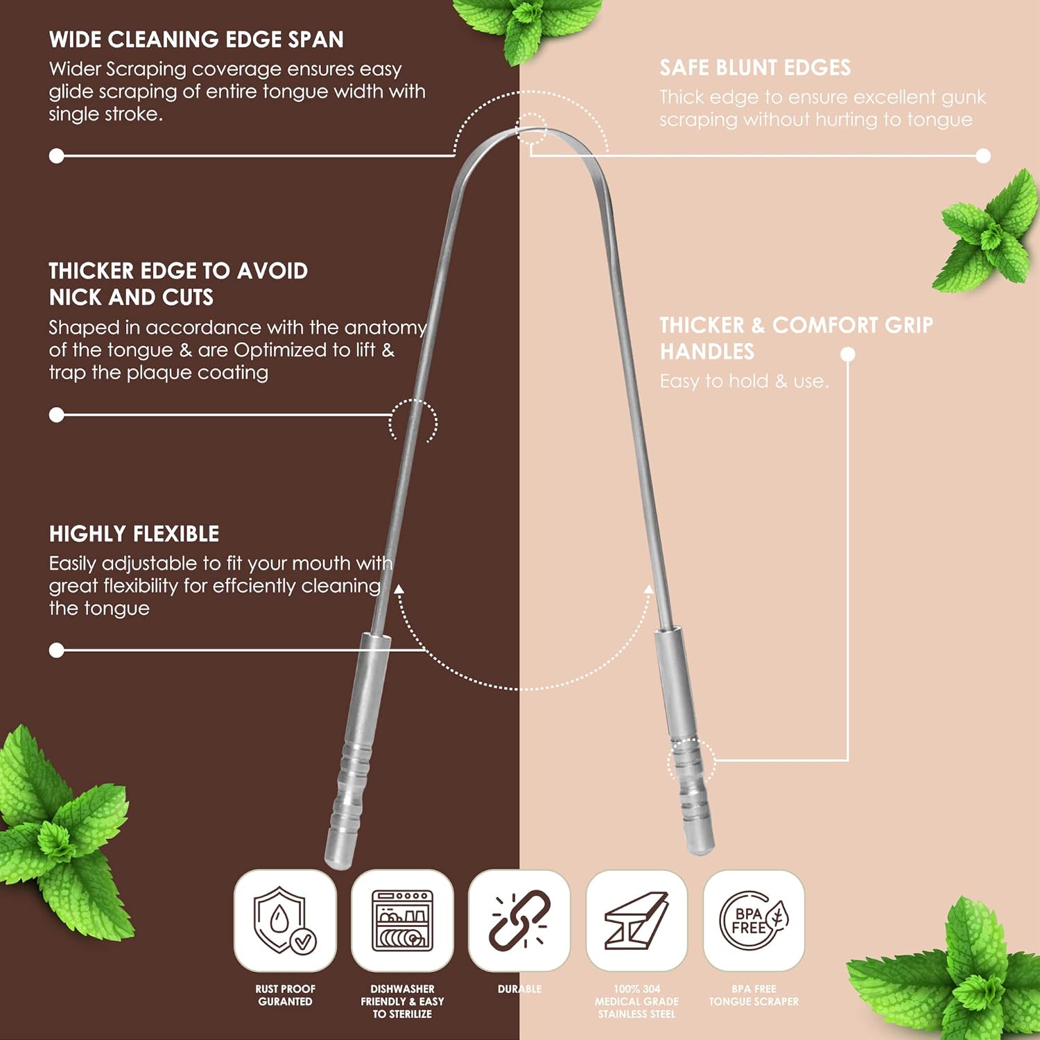 - ✅【STAINLESS STEEL TONGUE SCRAPER】- This tongue scraper is made of 100% 304 stainless steel, which is extremely durable and won’t rust over time. it's way better for the environment than plastic scrapers. The cleaning part is made of a smooth and rounded end that will not hurt your tongue.