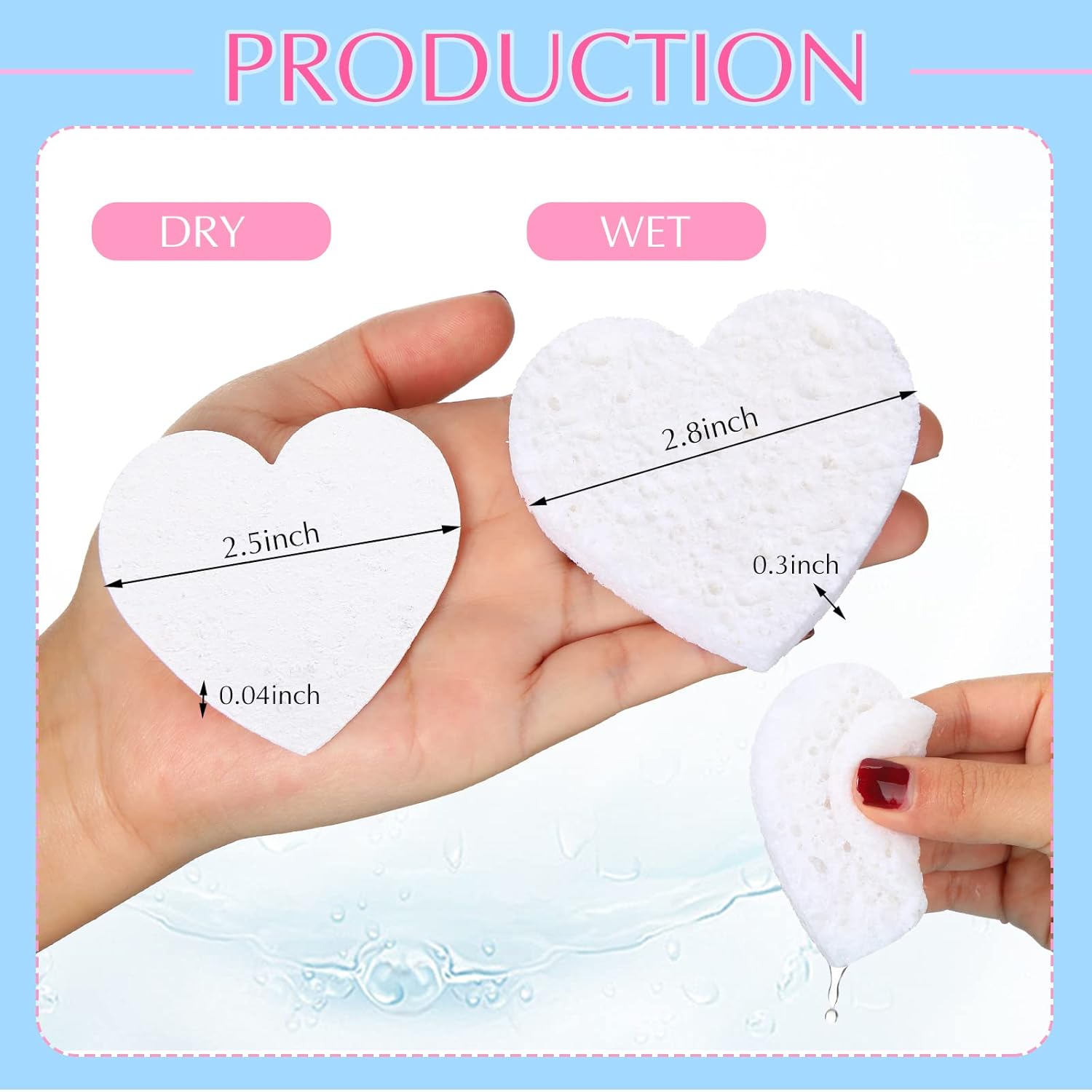 - Compression and Portability: these exfoliating face wash heart shaped sponges are compressed for easy storage and carrying, each sponge can expand to 2.8 inches wide and 0.3 inches thick after absorbing enough water; Please soak in water several times before use until it expands into full size