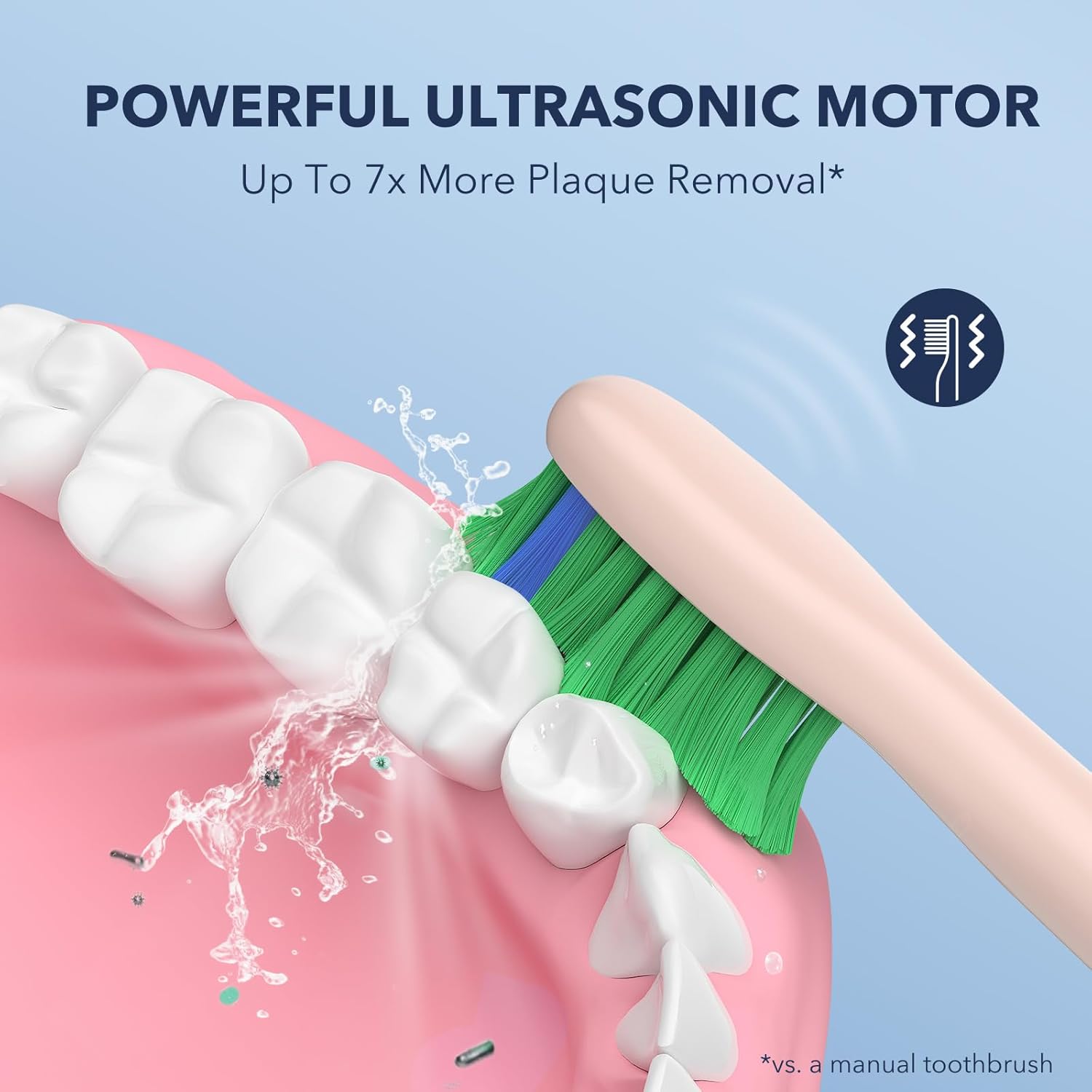 - 【Powerful Sonic Cleaning & 2-Mins Timer】--- Recommended by professional dentists --- [1] Ultrasonic toothbrush packed with the most up to date sonic technology for exceptional clean and remove up 7X plaques. It features a industry leading motor producing 40,000 vibrations per minute, can reach deep areas in the mouth that traditional toothbrushes may miss. [2] Built in smart timer control, 30 seconds interval reminding you to move to the next quadrant of your mouth, and totally in 2 minutes.
