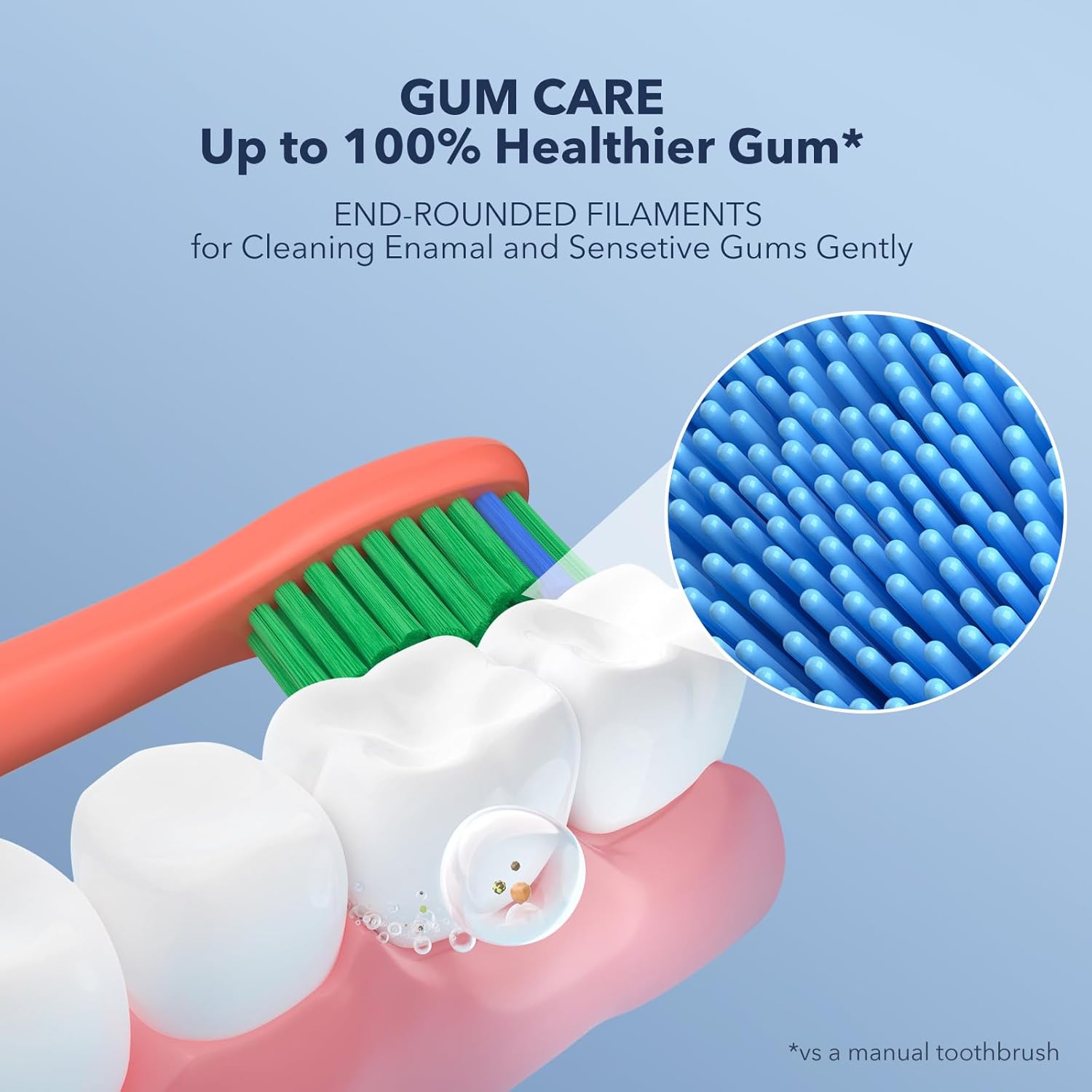 - 【"W" shape design & 4 DuPont Brush Heads】--- More comprehensive and gentle cleaning experience --- [1] Unique "W" shape design to suit teeth surfaces and remove up to 100% more stains from hard-to-reach spots, minimize the risk of damage to gums and tooth enamel. [2] Comes with 4 replacement toothbrush heads. Each brush head lasts 3 months so 4 heads will last for around one year.【NOTICE: Blue indicator bristles fade in color to let you know when it's time to replace the brush head】