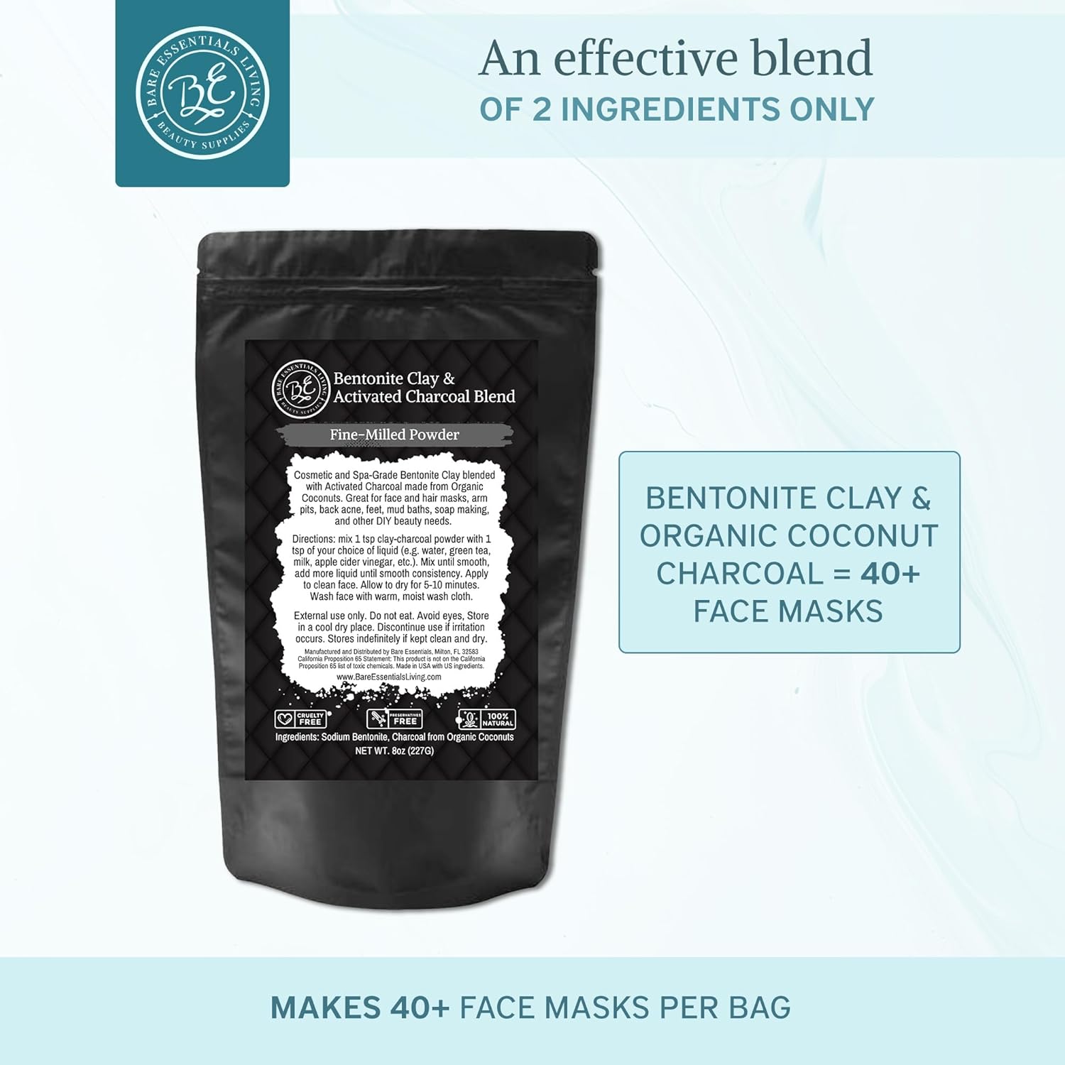 Bare Essentials Living - Bentonite Clay Powder and Activated Charcoal Powder Blend (8oz) Great for Charcoal Face Mask, Facial, Hair Mud Mask, DIY Bentonite Clay Toothpaste, & Charcoal for Soap Making