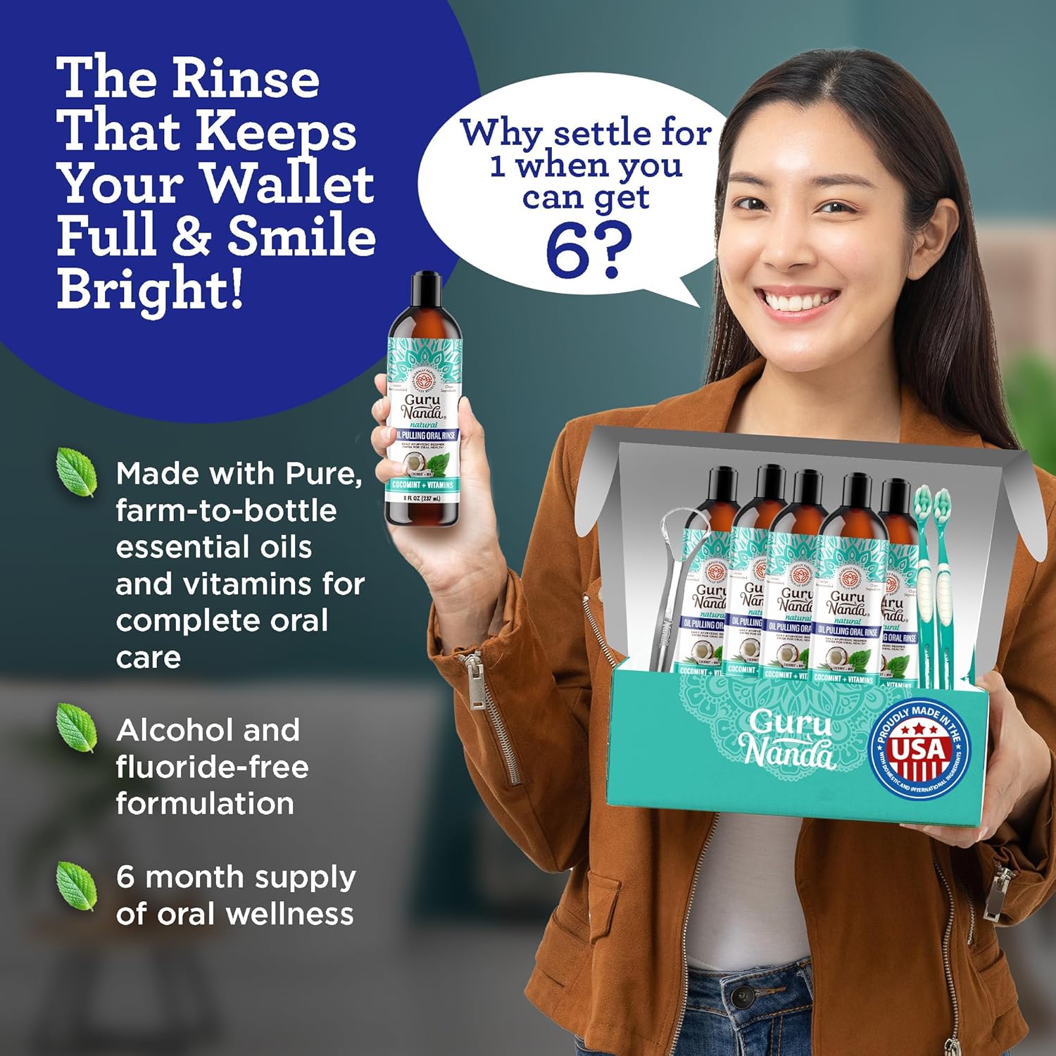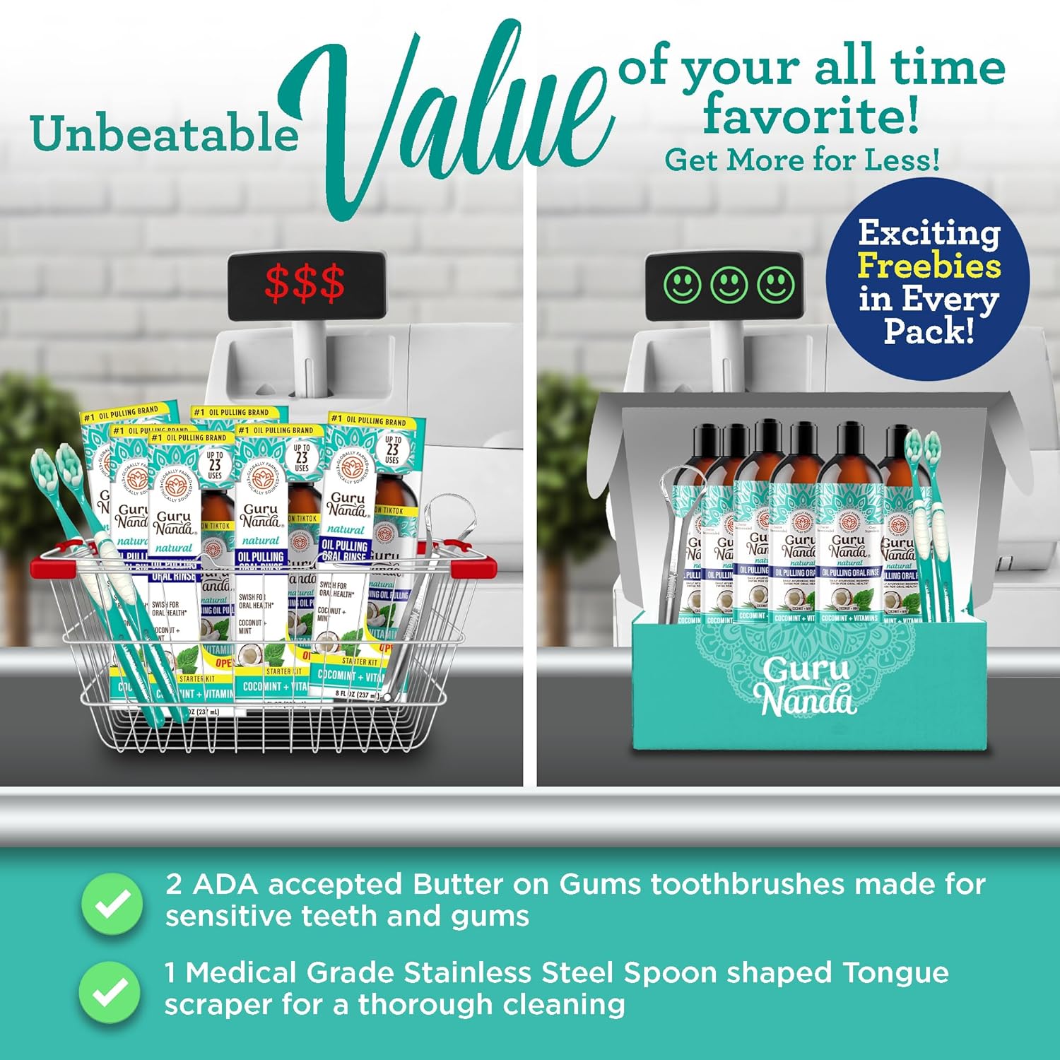 GuruNanda CocoMint Oil Pulling Mouthwash for Complete Oral Hygiene, 7 Essential Oils & Vitamins for Happy Teeth & Gums & Fresh Breath, with 2 Toothbrushes & Tongue Scraper, Alcohol-Free, 6X8 oz