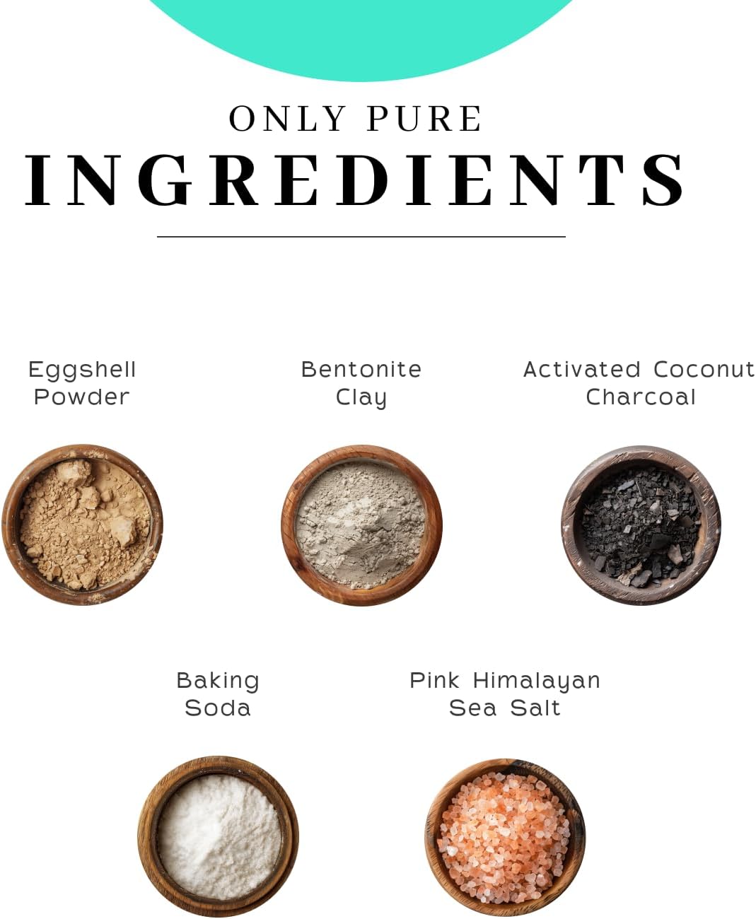 - Power Packed Ingredients - Our teeth whitening powder includes eggshell powder, bentonite clay, activated coconut charcoal, baking soda for cleaning and whitening teeth, and pink Himalayan sea salt for removing impurities