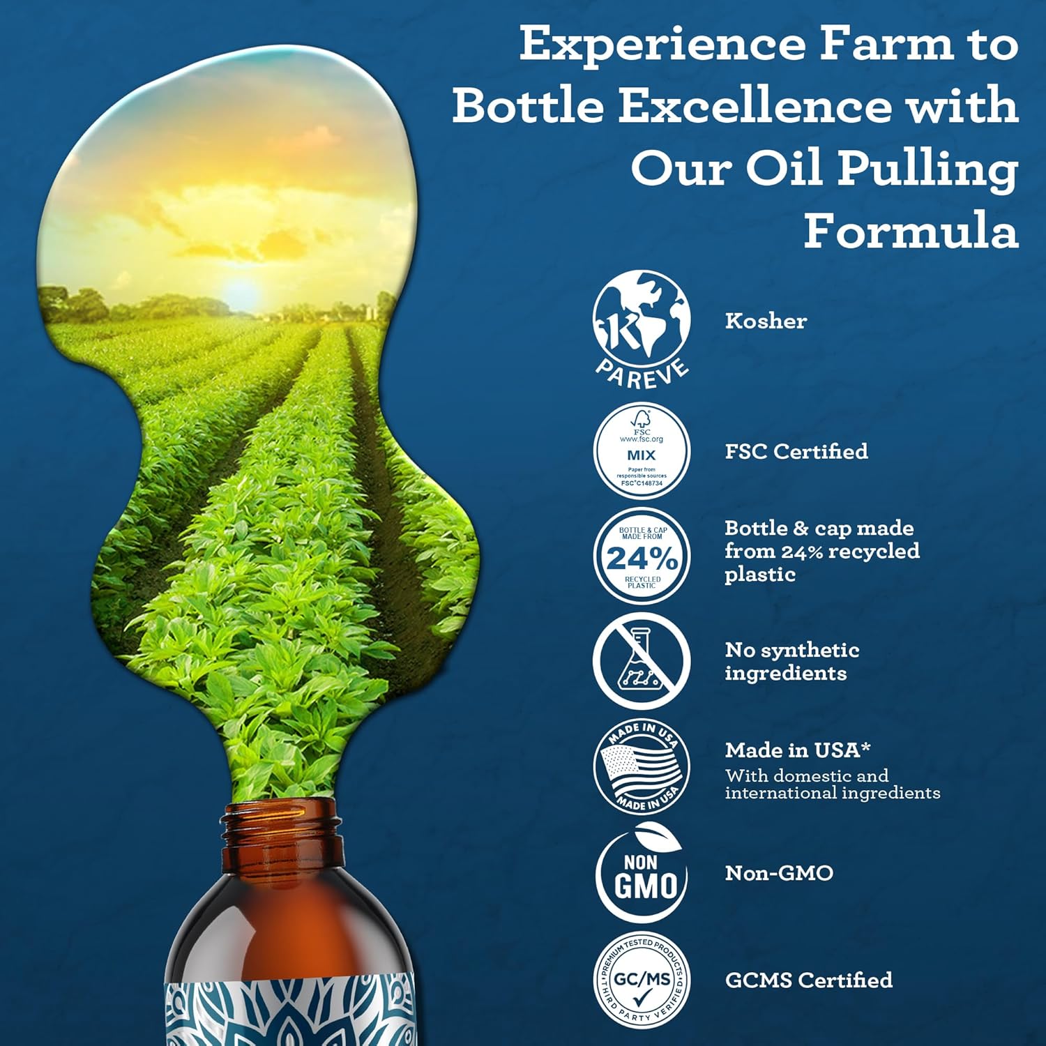 GuruNanda Advanced Oil Pulling Mouthwash for Enhanced Oral Care with Sesame & Oregano Oil, Promotes Deep Cleaning for Healthy Teeth & Gums, with Toothbrushes & Tongue Scrapers, Alcohol-Free, 3X8 Oz