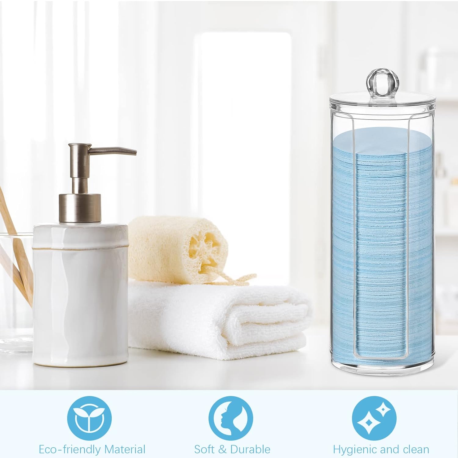 - Size Details: the diameter of the face exfoliator sponge is about 63 mm/ 2.5 inches, and the thickness is about 1 mm/ 0.04 inch under compression, the diameter is about 68 mm/ 2.68 inches, the thickness will expand to about 8 mm/ 0.31 inches after absorbing water; The diameter of the transparent acrylic container is about 7 cm/ 2.76 inches and the height is about 20 cm/ 7.87 inches, enough for you to store your sponges