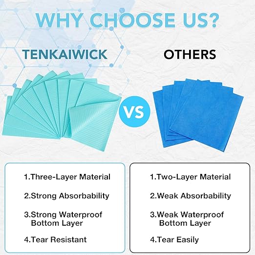 - Premium material: Our dental bibs are made of premium paper and polyethylene film, the paper has good water absorption, is soft to the touch, and can be bent into any angle for easy placement; durable and not easy to tear