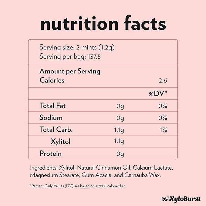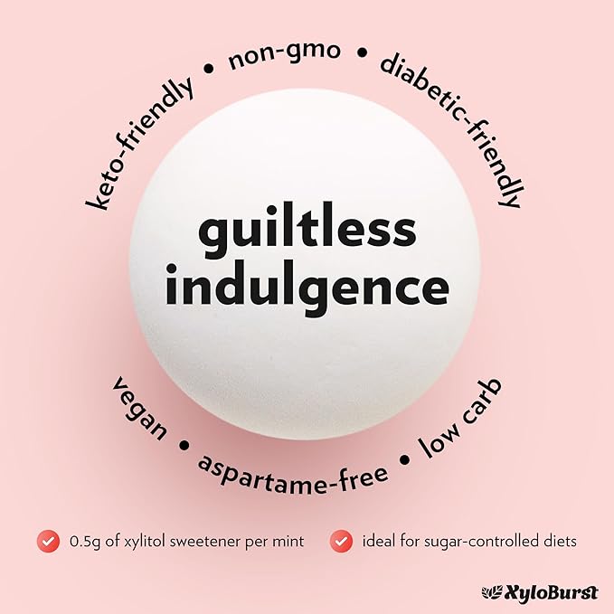 - BOOST ORAL HEALTH - Professional studies suggest that high xylitol consumption, coupled with daily brushing, reduces tooth decay risk. XyloBurst sugar free mints provide an easy way to reach the recommended 6 to 8 grams of xylitol daily, promoting healthier gums and teeth, leading to fewer cavities and a brighter smile