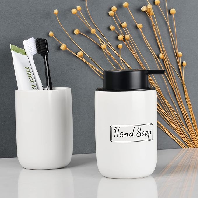 BosilunLife White Soap Dispenser Set - 2 Pack 12oz Ceramic Dish Soap Dispenser with Rust Proof Pump for Kitchen, Hand Soap and Lotion Set Suitable for Farmhouse Bathroom Decor with Waterproof Labels