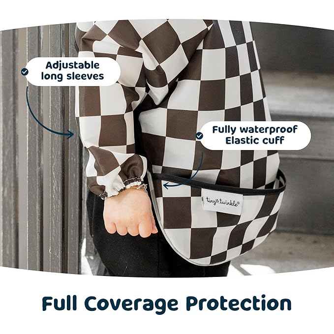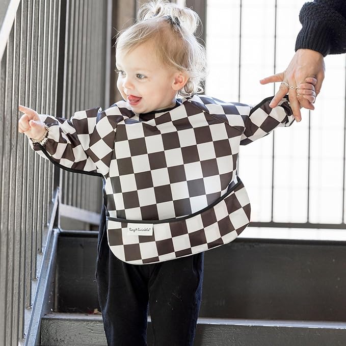 Tiny Twinkle Long Sleeve Bib for Babies & Toddlers – Waterproof Smock Bib for Eating – Machine Washable & Mess-Proof, Baby Feeding Essential & Shower Must-Have(Checkers Black, 6–24M)