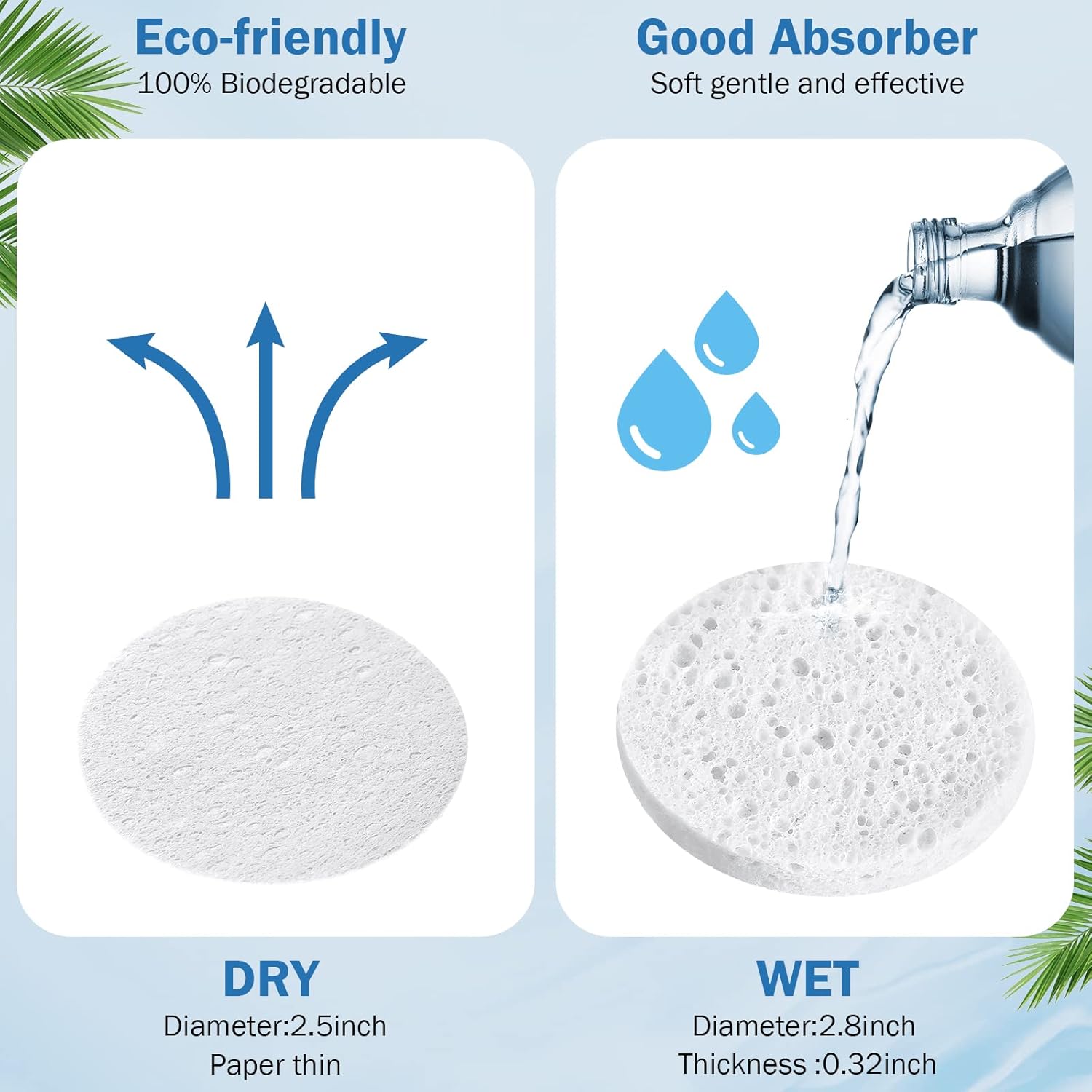 - Size Information: the diameter of the facial sponge is about 2.5 inches/ 63 mm, and the thickness is about 0.04 inches/ 1 mm in compressed state; After absorbing water, the diameter will expand to about 2.7 inches/ 68 mm, and the thickness will expand to about 0.3 inches / 8 mm; This face sponges for cleansing is lightweight and easy to carry, making it a great travel companion