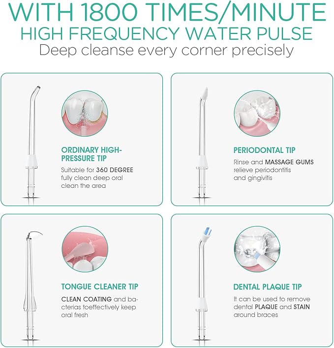 - Special Feature : Deep Cleaning for Teeth and Gums - Adopt 2022 latest water flosser pulse technique, high frequency water pulse 1800 times/min can effectively remove 99.99% food residue hidden deeply and massage the gum to improve swelling and pain. Also the this water floss is beneficial for bleeding gums, bad breath, brace and bridge care. Deep Cleaning for Teeth and Gums - Adopt 2022 latest water flosser pulse technique, high frequency water pulse 1800 times/min can effectively remove 99.99% food resi… See more