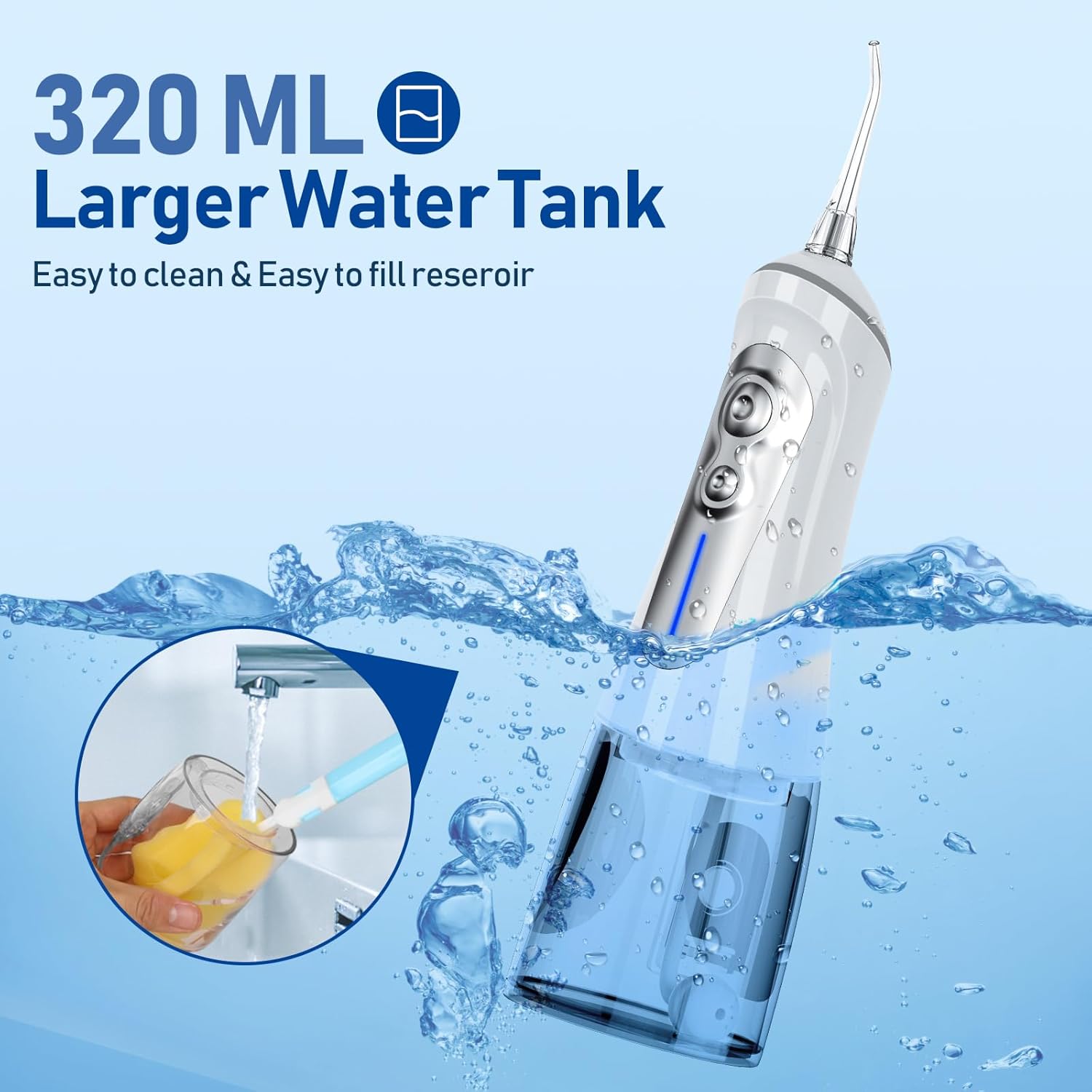 - 【Upgraded 320ml Large Capacity Water Tank & IPX7 Waterproof】This water dental flosser features an upgraded 320ml water tank, has a larger water capacity than other modes, eliminating the need for frequent refills and making your oral cleaning more convenient and efficient.And our wireless water dental pick boasts superior waterproofing, allowing easy cleaning and safe use during showers.