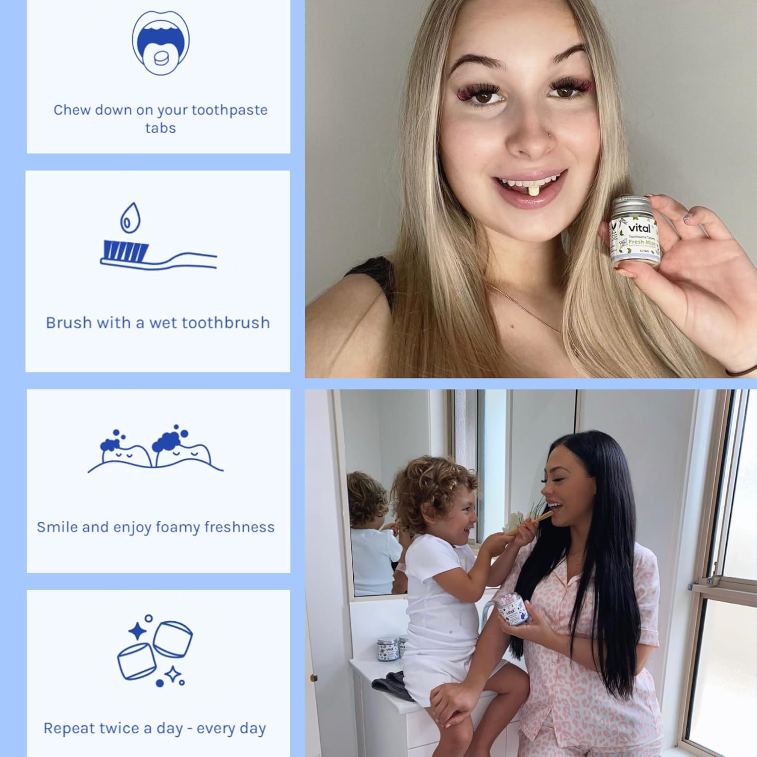 Vital Toothpaste Tabs with Nano-Hydroxyapatite | Naturally Whitens + Remineralizes Teeth | Fluoride & Plastic Free | Combats Sensitivity | Travel & Eco Friendly | Charcoal Mint | 62 Tablets (1 Month)