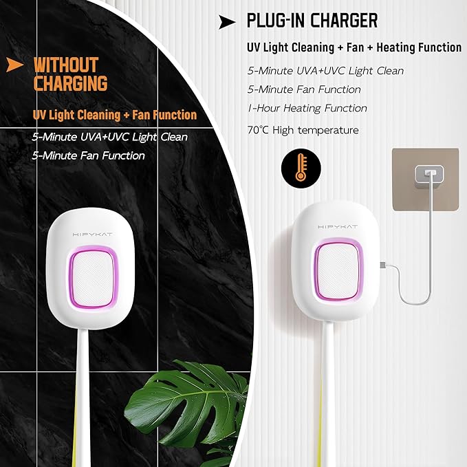 - 🦷Unique heating function: While charging, the toothbrush cartridge will automatically the heating function for 1 hour. with the 5min fan function, it ensures that your toothbrush is completely dry and free of dustparticles.