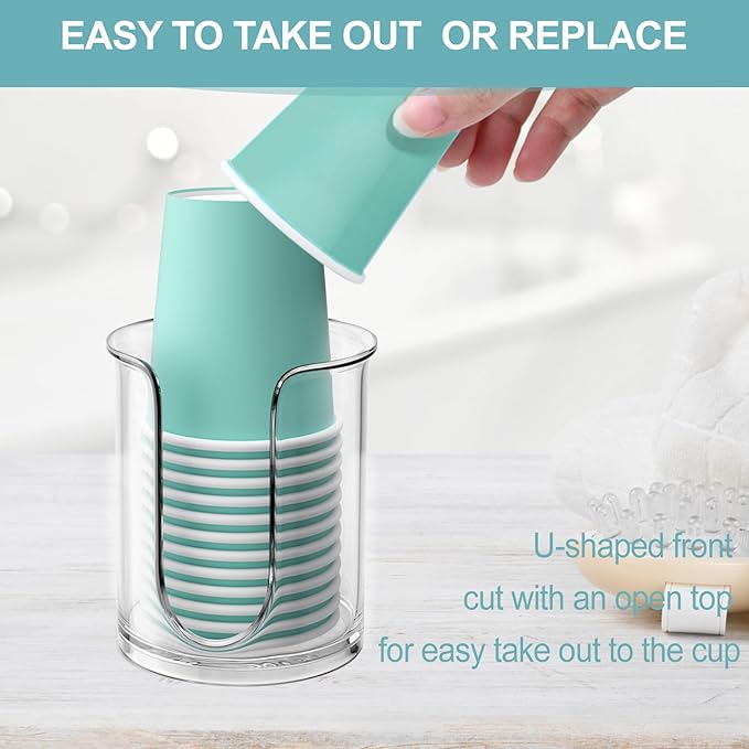 - The U-shaped notch design of the cup dispenser makes it easier to grab cups, and the open front allows you to keep track of when it's time for a refill. This multi-functional cup holder can even be used to store cotton make-up rounds.