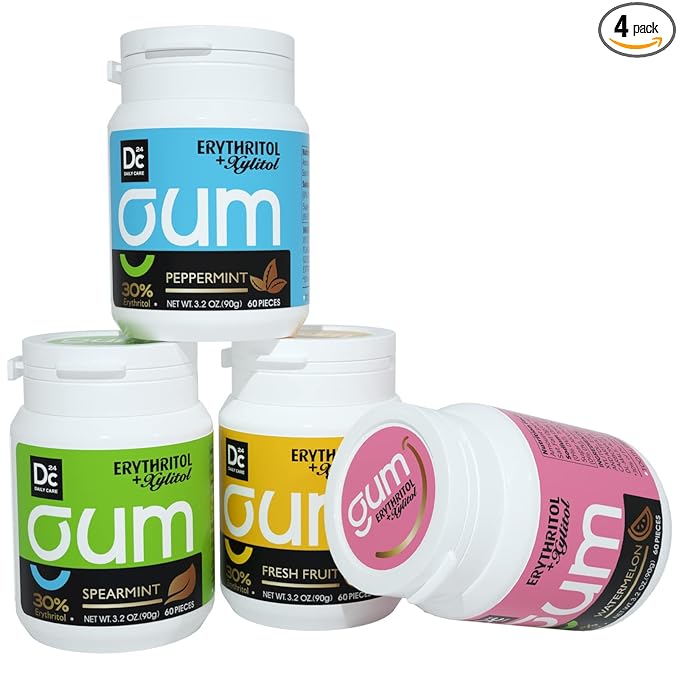 DC24 DAILY CARE Xylitol Chewing Gum with Erythritol, Aspartame Free & Sugar Free Gum for Dry Mouth, Low-Calorie, Sugarless, Assorted Flavors Variety Bulk Pack 60-Piece Pack, 4 Packs