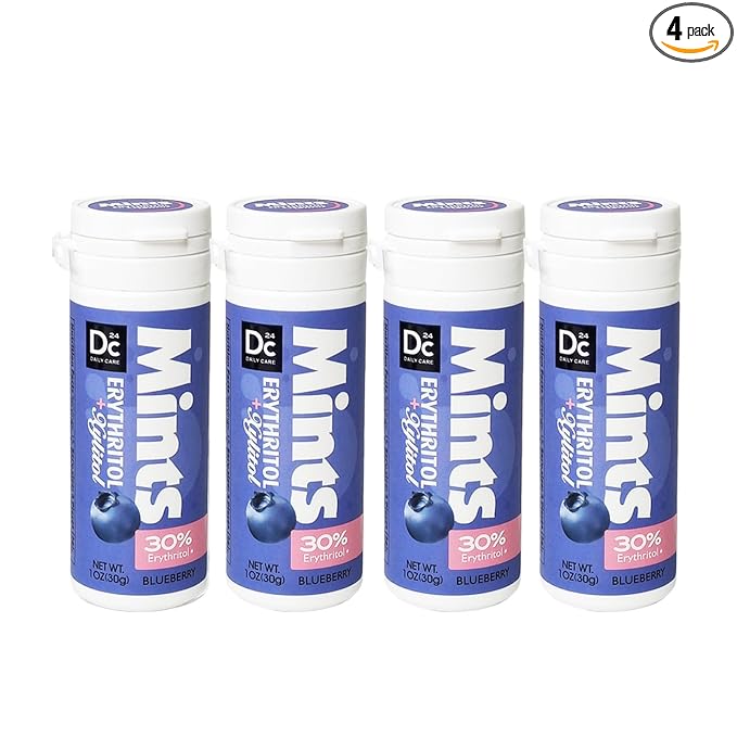 DC24 DAILY CARE Xylitol Erythritol Mints, No Aspartame Sugar Free Hard Candy, Low-Calorie, Dry Mouth Drops Keto Blueberry 30 Pieces (Pack of 4)
