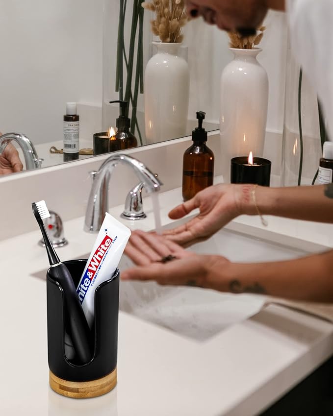 - π Compact Size: The cups in this holder have a capacity of 5oz, and the organizer itself has dimensions of 5.43 inches in diameter and 3.74 inches in height, with a 0.78 inch bamboo wood base. It fits well on bathroom vanities and countertops, and is small enough for pedestal sinks. It's also suitable for use in small living spaces such as apartments, RVs, and tiny homes.
